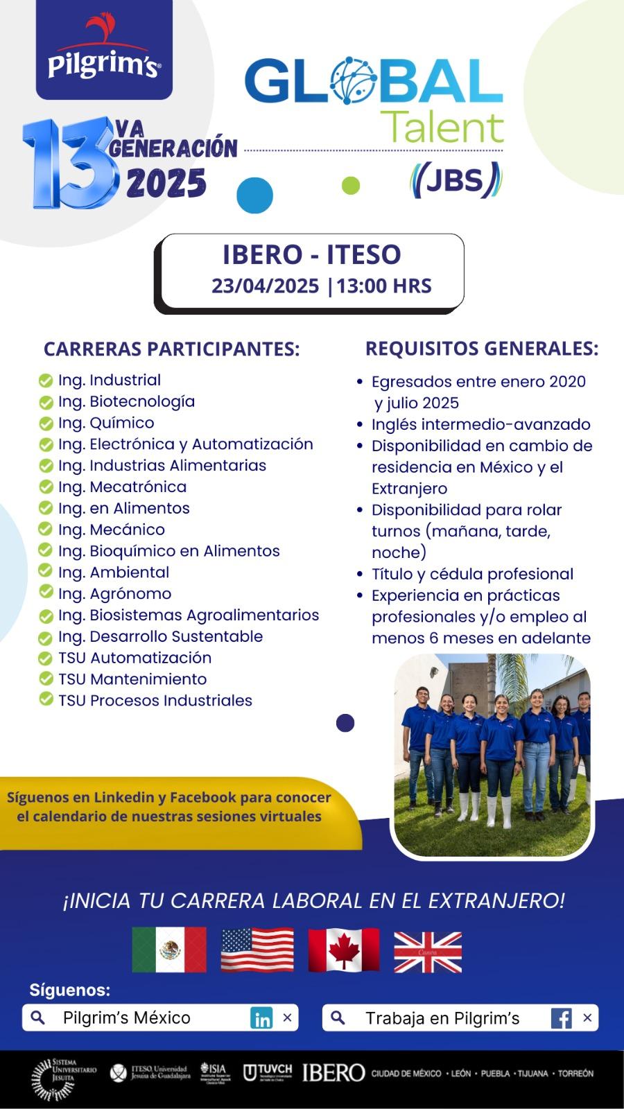Participa en la sesión informativa y de reclutamiento de Pilgrim´s y conoce más sobre su programa de trainees y el proceso para integrarse a JBS, la empresa de proteína animal más grande del mundo y de la cual Pilgrim’s forma parte como empresa líder en el sector avícola.